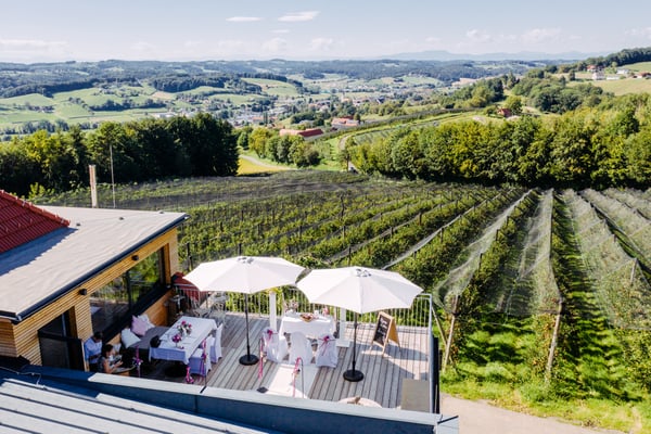 - großflächige Terrasse mit traumhaftem Blick bis zum Schöckl und in die vielfältige südoststeirische Landschaft